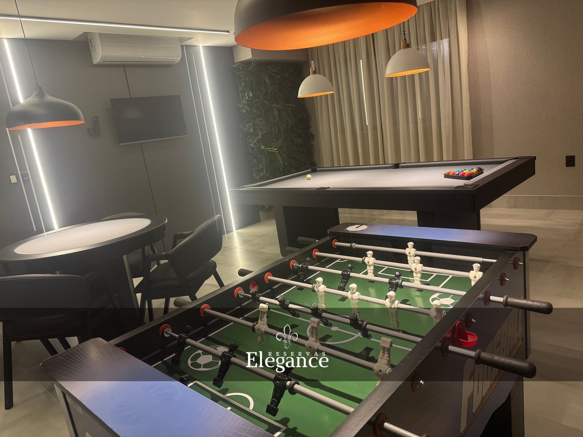 - Sala de jogos equipada com mesa de sinuca, pebolim e mesa para jogo de xadrez/cartas, ar condicionado, tv smart e sistema de som por bluetooth;